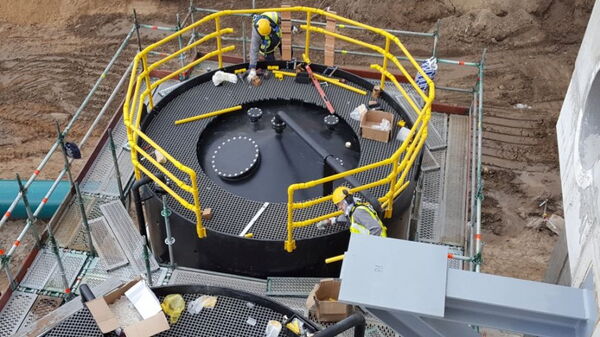 Megbíztak minket a platformok és korlátrendszer építésével két polietiléntartályon. Mivel a tartályok műanyagból készültek, az anyagunk tökéletesen illeszkedett az egészhez. A korlát oszlopai a tartály oldalsó felületéhez lettek rögzítve, amely egyúttal alsó korlátot is képezett. A két tartályt összekötő hidat is elkészítettünk. A híd rozsdamentes acélból készült rögzítők segítségével lett felfüggesztve, amelyeket numerikus hajlítógépen a tartályok kerületéhez profiloztak.